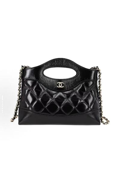 Black Glossy Quilted Diamond-Pattern Bag with Oval Handle & Metal Chain (Tote & Crossbody)