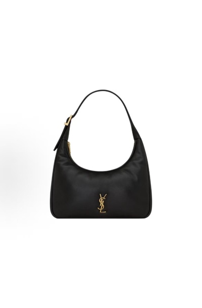 Black Leather Crescent Shoulder Bag with Metal Accent