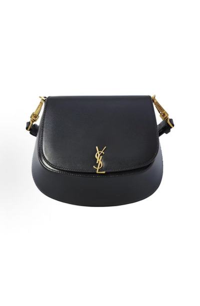 Black Leather Curved Flap Crossbody Bag with Gold-Tone Hardware