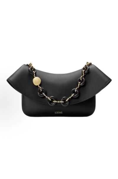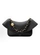 Black Leather Half-Moon Bag - Black & Gold Contrast Chain Shoulder Bag with Retro Metal Emblem Underarm Style