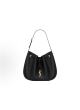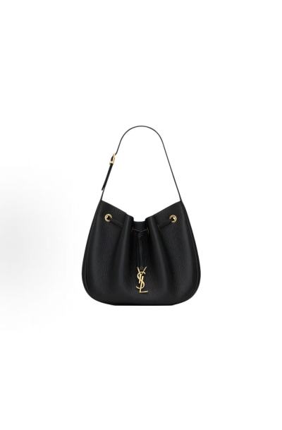 Black Pebbled Leather Drawstring Bucket Bag with Metal Accent, Shoulder & Crossbody Style
