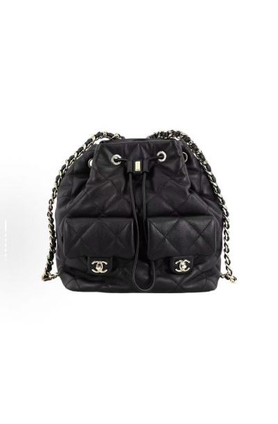 Black Quilted Double-Pocket Drawstring Bucket Bag with Metal Buckle & Chain Dual-Strap Backpack