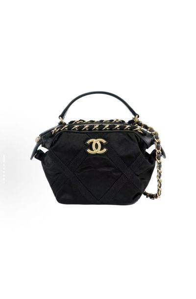 Black Quilted Nylon & Leather Satchel with Metal Chain Detail - Top Handle & Crossbody Bag