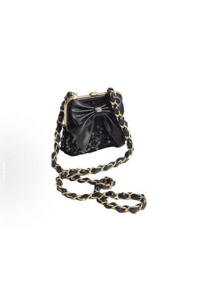Black Sequin & Leather Bow Kiss-Lock Bag with Black-Gold Braided Chain Crossbody