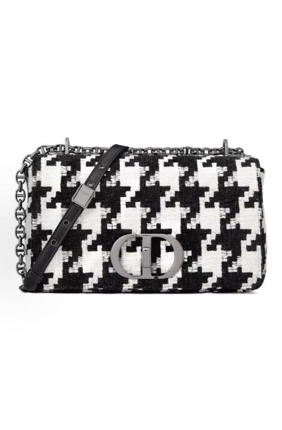 Black & White Houndstooth Fabric Chain Bag, Metal Double-Ring Buckle Accent, Leather-Panel Adjustable Strap Crossbody Bag