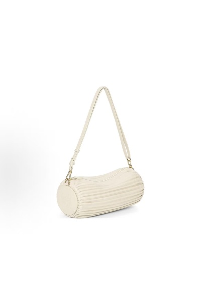 Cream White Pleated Leather Cylinder Bag, Adjustable Strap Shoulder & Crossbody Women's Handbag