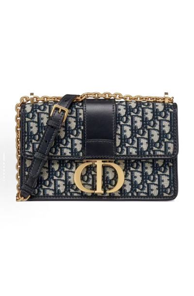 Navy Vintage Monogram Fabric Chain Bag, Metal Double-Letter Buckle Accent, Leather-Panel Wide-Strap Crossbody & Shoulder Bag